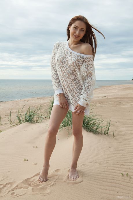 Erotic Beauty: Thin Teen Lena Raz presenterar sina små bröst och poserar naken på stranden