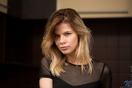 Nubiles: 金发模特 Juliya 脱下黑色连衣裙,然后触摸自己的阴部