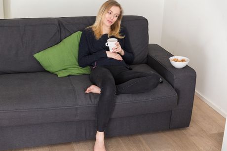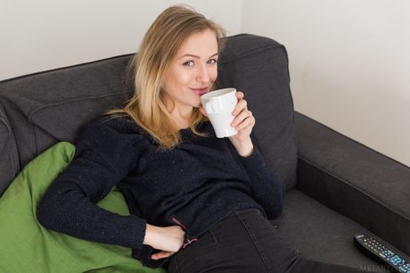 Met Art: 金发少女 Aislin 脱掉黑色胸罩和内裤,在沙发上摆出裸体姿势