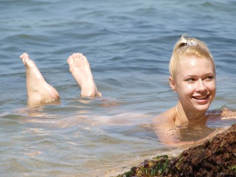 Love Hairy: 金发少女安吉-T 在沙滩上脱衣