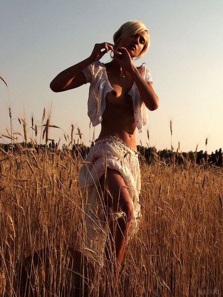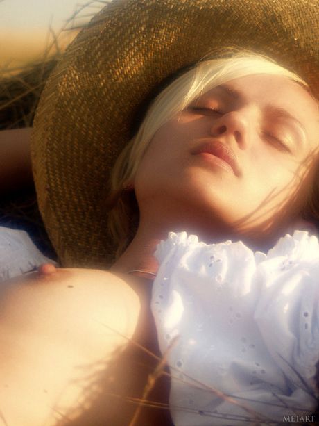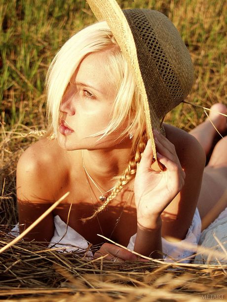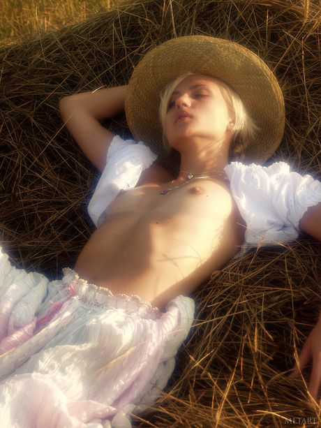 Met Art: 金发少女 Olya A 在干草地上脱光衣服,露出毛茸茸的阴部