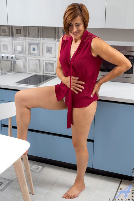 Anilos: 成熟主妇埃莉诺在厨房展示她的大奶子和毛茸茸的阴部