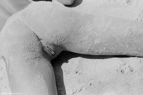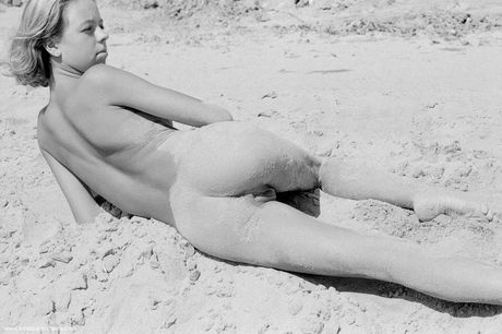Errotica Archives: 奥尔加在沙滩上展示剃光的阴道口