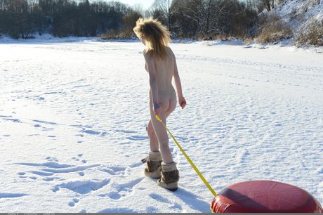 Domai: 瘦削的金发女郎 Angelika D 在雪地里裸露身体,展示她的小乳房和小屁股