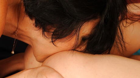 Old Young Lesbian Love: 身材苗条的女孩 Margo T. 和 Jeanine Hot 穿着丝袜,在火热的女同性恋性爱中互相舔对方的阴部