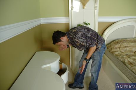 Naughty America: 纹身美洲狮佩顿-莉与年轻男子在床上发生性关系