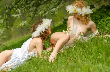 Stunning 18: 少女同性恋多琳达 N 和伊莱克特拉 U 戴着花冠在花园里裸体